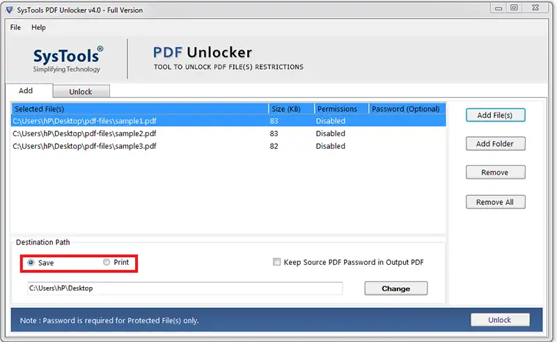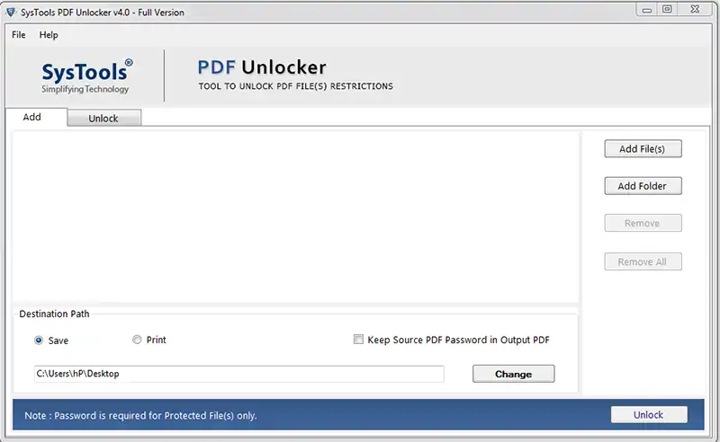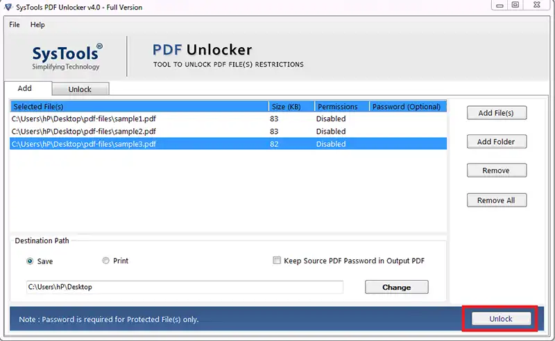 You can unlock multiple PDF files in batch having a common file restriction or some special restriction using this tool. However, to unlock protected PDF files in bulk the Adobe PDF Unlocker software provides Add Files / Add Folder option to insert multiple PDFs.